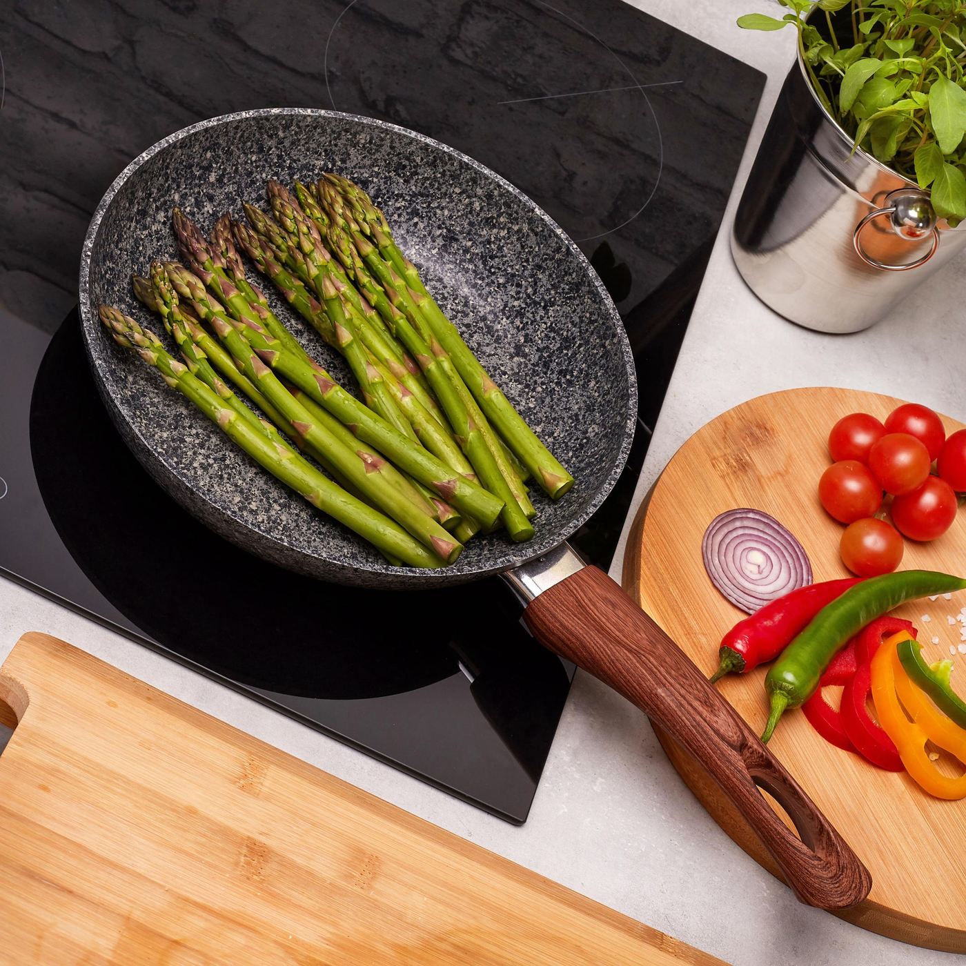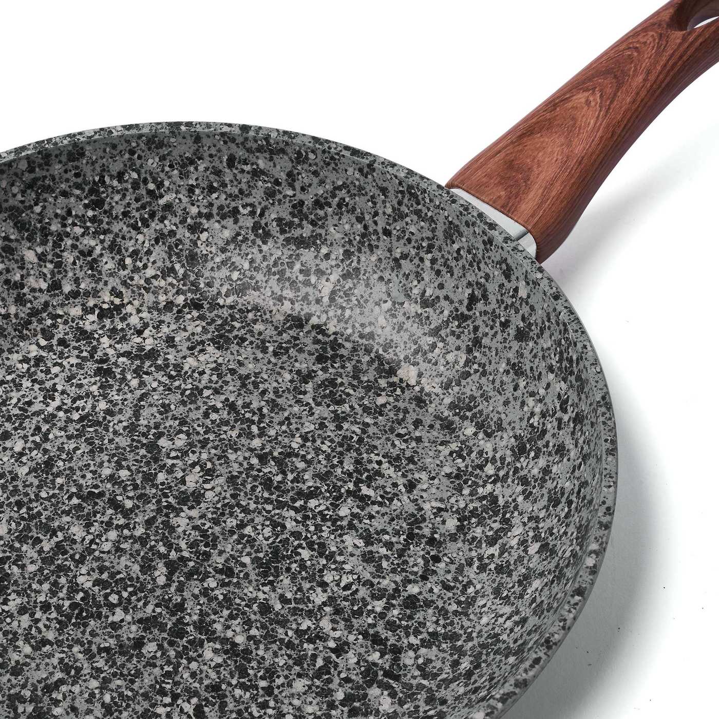 Granitna nelepljiva prevleka preprečuje, da bi živila gorela, zato lahko za cvrtje porabite veliko manj maščobe. Zahvaljujoč temu boste pripravili okusnejše in bolj zdrave jedi . Udoben mehak ročaj na dotik poveča varnost uporabe izdelkov.